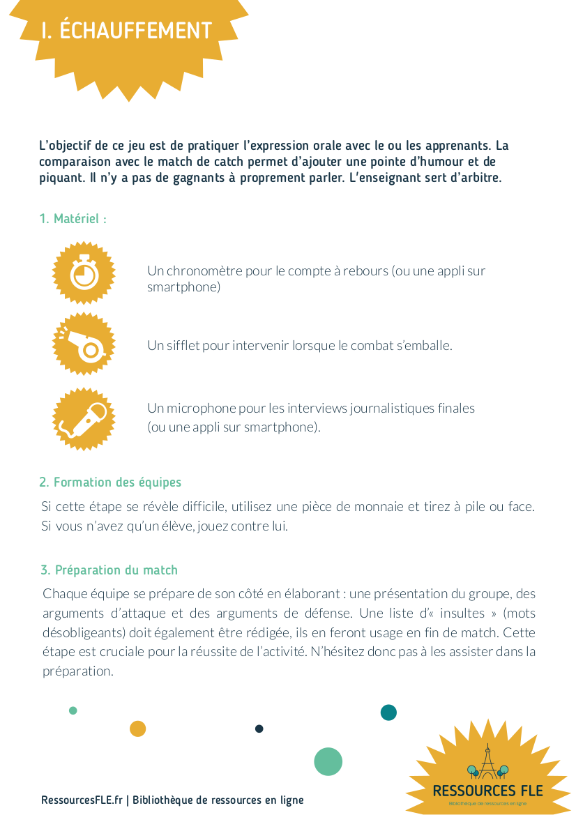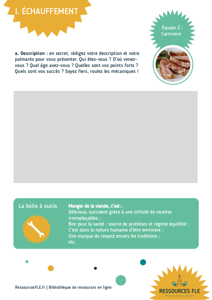 Fiche pédagogique professionnelle composée de 3 documents : un pour l’enseignant et un pour chaque équipe. Cette ressource est destinée à des apprenants de fle niveau B1 ou B2.