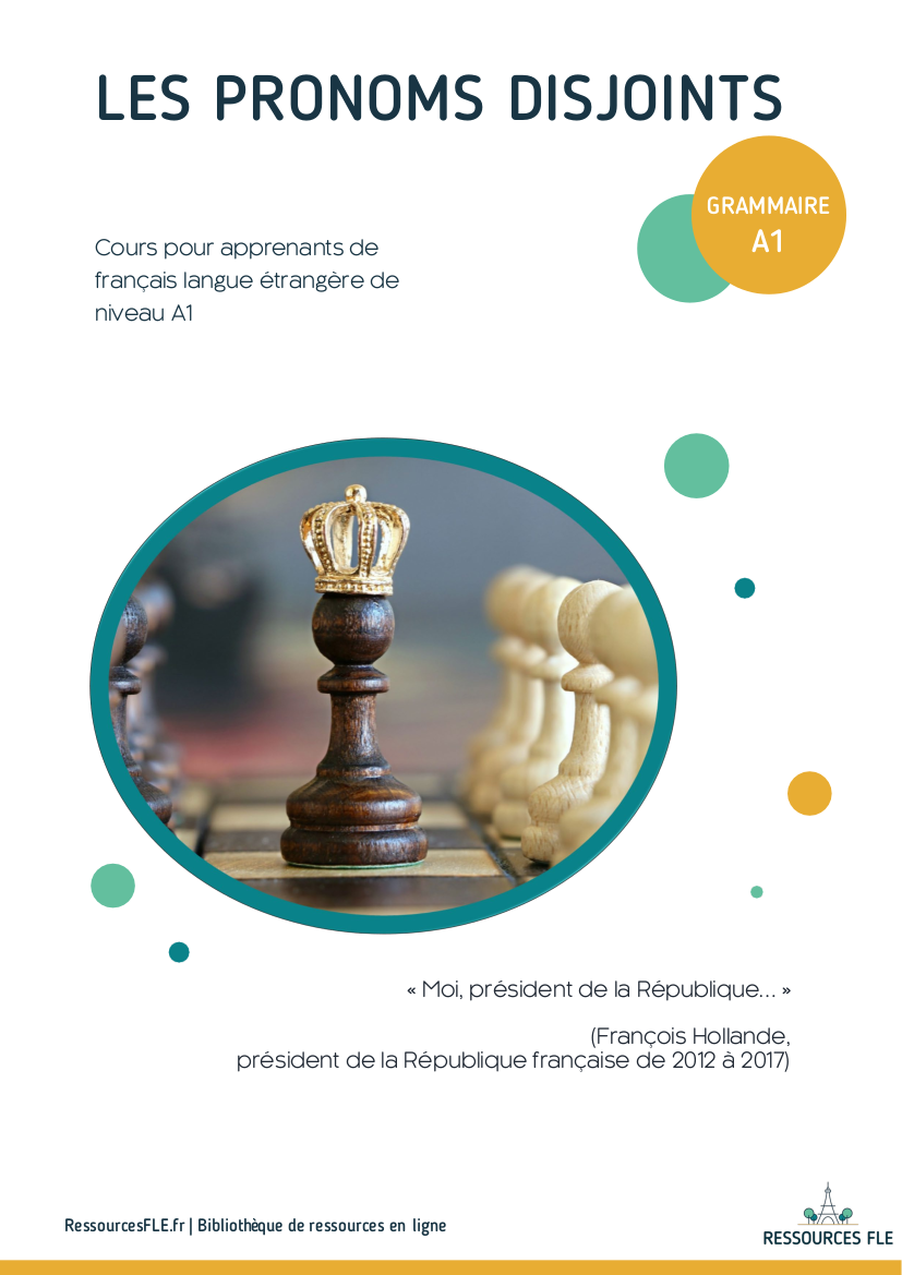 Dans cette ressource, composée de 16 pages, nous proposons à vos apprenants de découvrir puis maîtriser les pronoms personnels disjoints en plusieurs étapes :
